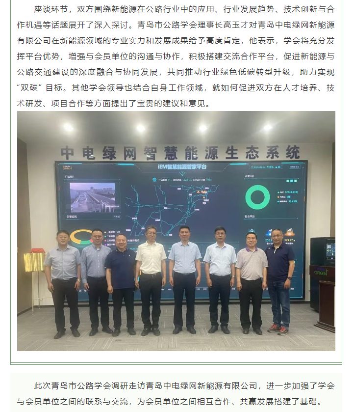 隨后,青島中電綠網新能源有限公司就公司整體情況向學會領導作了詳細匯報。匯報內容涵蓋公司的發展歷程、業務范圍、市場拓展、項目成果以及未來規劃等方面,重點突出公司在新能源領域的創新實踐與取得的成績,同時結合行業發展趨勢,闡述了公司在新能源與公路建設融合方面的探索與思考,表達了期望與學會及公路行業其他單位開展更深入合作的意愿。