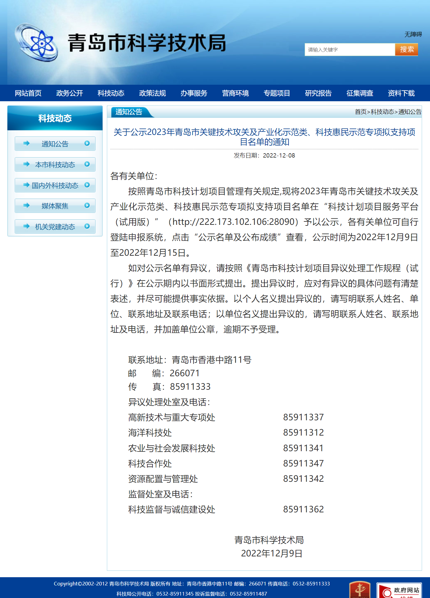 2022年12月9日,青島市科技局公布《關于公示2023年青島市關鍵技術攻關及產業化示范類、科技惠民示范專項擬支持項目名單的通知》,將2023年青島市關鍵技術攻關及產業化示范類、科技惠民示范專項擬支持項目名單予以公示。