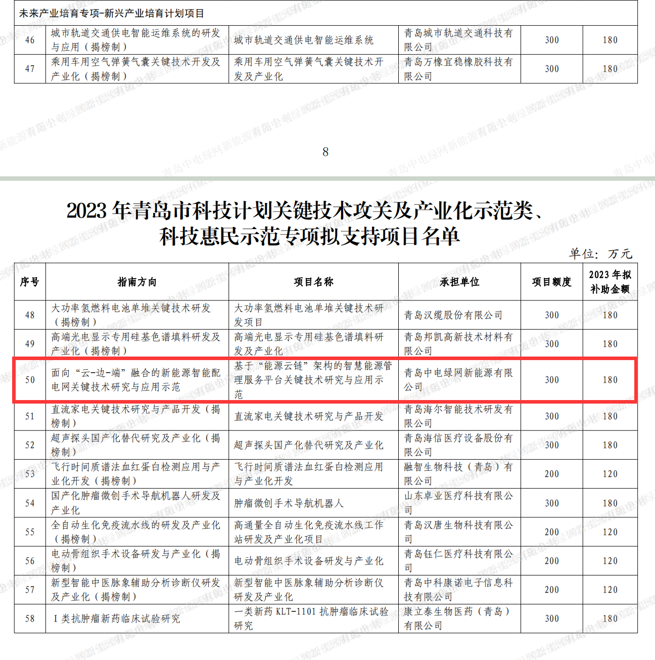 經過專家答辯、評選及政府、專家現場考察,青島中電綠網新能源有限公司已成功入選青島市“2023年青島市關鍵技術攻關及產業化示范類-未來產業培育專項-新興產業培育計劃項目”擬支持項目承擔單位, 政府資助資金300萬。