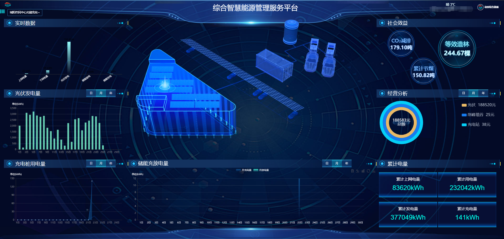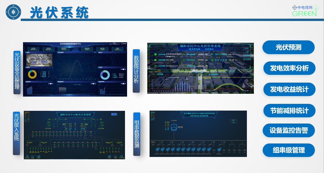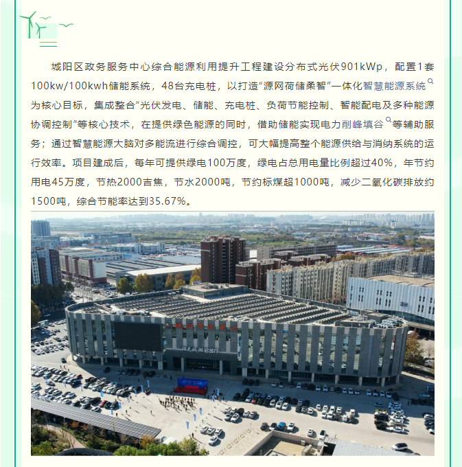 1.png?? ?城陽區政務服務中心綜合能源利用提升工程建設分布式光伏901kWp,配置1套100kw/100kwh儲能系統,48臺充電樁,以打造“源網荷儲柔智”一體化智慧能源系統為核心目標,集成整合“光伏發電、儲能、充電樁、負荷節能控制、智能配電及多種能源協調控制”等核心技術,在提供綠色能源的同時,借助儲能實現電力削峰填谷等輔助服務;通過智慧能源大腦對多能流進行綜合調控,可大幅提高整個能源供給與消納系統的運行效率。項目建成后,每年可提供綠電100萬度,綠電占總用電量比例超過40%,年節約用電45萬度,節熱2000吉焦,節水2000噸,節約標煤超1000噸,減少二氧化碳排放約1500噸,綜合節能率達到35.67%。1216.png??? 中電綠網承接、參建的城陽市民中心項目,以打造“源網荷儲柔智”一體化智慧能源系統為核心目標,集成整合“光伏發電、儲能、充電樁、智能配電及多種能源協調控制”等核心技術,在提供綠色能源的同時,借助儲能實現電力削峰填谷等輔助服務;通過智慧能源大腦對多能流進行綜合調控,可大幅提高整個能源供給與消納系統的運行效率。為用戶在成本收益管理方面,提供了精細化收益管理,實現光儲充荷收益綜合管理。