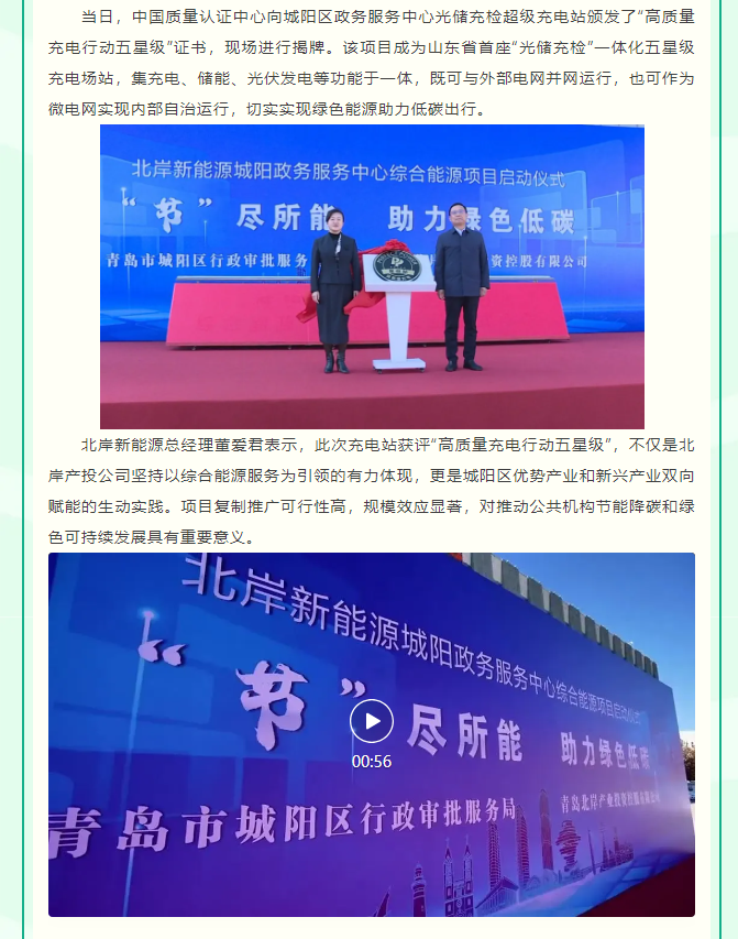 11月22日上午,城陽區政務服務中心綜合能源利用示范項目啟動儀式暨五星級電動汽車充電站揭牌儀式在城陽區政務服務中心隆重舉行。城陽區委常委、區政府副區長夏英平,區發展改革局、區財政局、區住房城市建設管理局、區行政審批局、區機關事務服務中心、區檢驗檢測產業發展中心、城陽街道等單位有關領導,中國質量認證中心青島分中心、北岸產投公司、各參建單位等相關負責同志出席了此次活動。